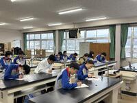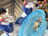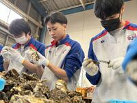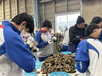 2月25日(水)生物環境科1年生が総合実習で「牡蠣剥き」の体験をしました。地元の主要な産業である牡蠣養殖を理解するための実習で生徒たちは2班に分かれ、牡蠣についての学習と、実際の牡蠣剥きに挑戦しました。数人の生徒は何度か体験したことはあるものの、たくさんある殻付きの牡蠣を目の前にして戸惑っていました。実際に剥いて見せ貝柱の位置を確認したり、牡蠣剥きナイフの使い方を知らせたりしていざ実践です。牡蠣殻の間にうまくナイフが入らなかったり、中の身を傷つけたりを繰り返しながらも挑戦を続けることで、殆どの生徒が後半は上手に牡蠣を剥くことができるようになりました。最後は実習終わりの楽しみ、自分たちが剥いた牡蠣を牡蠣汁やフライパンで調理した焼き牡蠣にして食べました。苦手な生徒も食べてみて「美味しかった」という声が多く、実習の充実感を味わえたようでした。