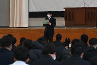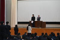 『開講式』のあと、『12月月間皆勤表彰』が行われました!1年生は船舶運航科 及川瑠偉くん、2年生は航海技術類型 勝又 輝くん、3年生は調理類型 後藤優人くんが代表で賞状を受け取りました。表彰後、1学年主任の遠藤先生から『月間皆勤を目指すこと、健康管理』について講話をいただきました!